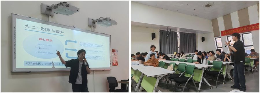 在互动交流环节,同学们踊跃提问,就课程学习、科研训练与学业规划等问题与学长、老师们进行了深入探讨,现场气氛热烈。班主任周华金老师总结强调了大三阶段的学习重点与关键任务。