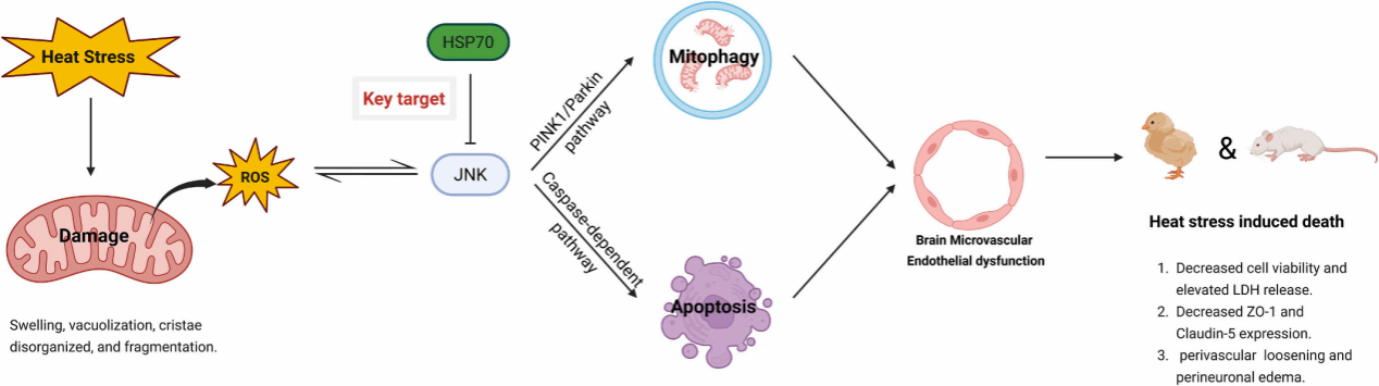 该研究结合文昌鸡和小鼠体内模型及脑微血管内皮细胞体外模型,系统解析了HSP70-JNK轴介导热应激脑微血管内皮损伤的分子机制,深化了对热应激诱导动物中枢神经系统损伤机制的认识,并为热带高温环境下降低畜禽死亡风险、提升生产效益提供了重要的潜在干预靶点。
